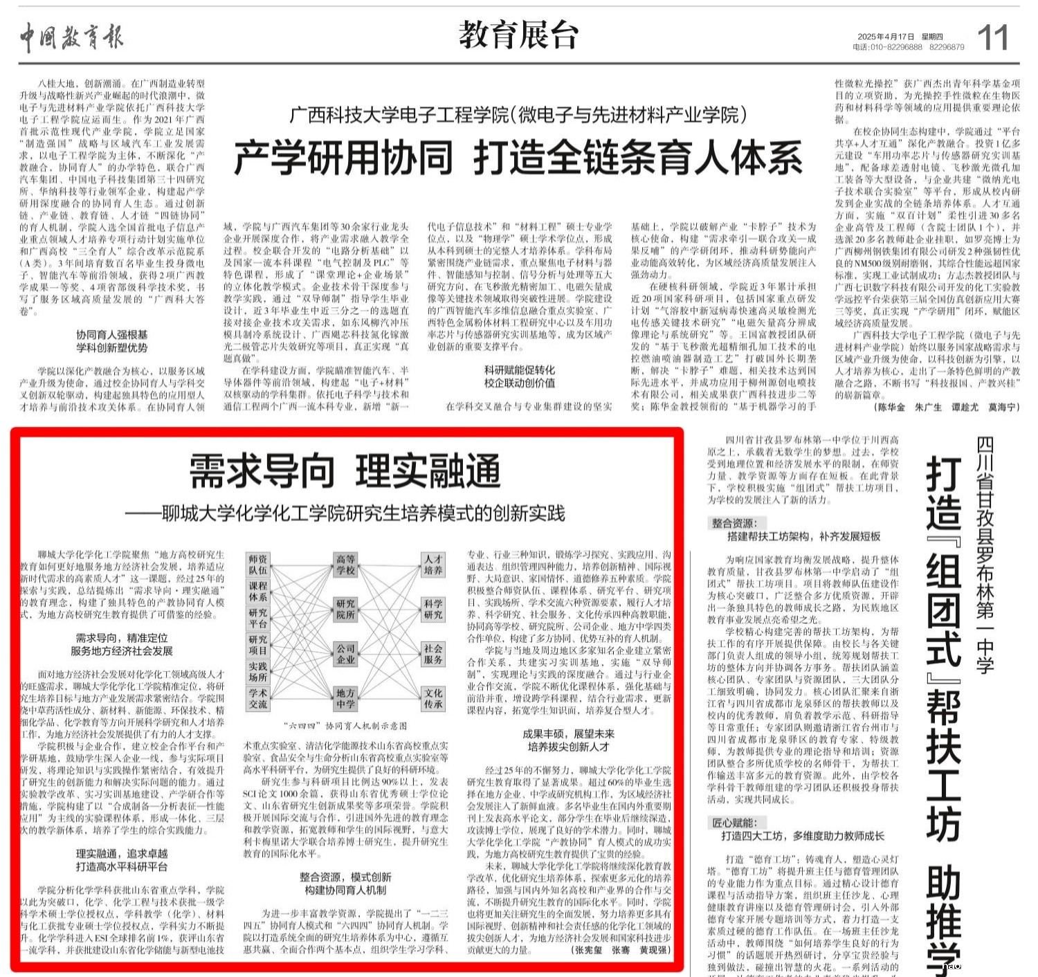 【编者按】4月17日,《中国教育报》的“教育展台”版面以《需求导向 理实融通——雷竞技app下载官方版化学化工学院研究生培养模式的创新实践》为题报道化学化工学院在研究生培养工作中的先进教育理念和做法。